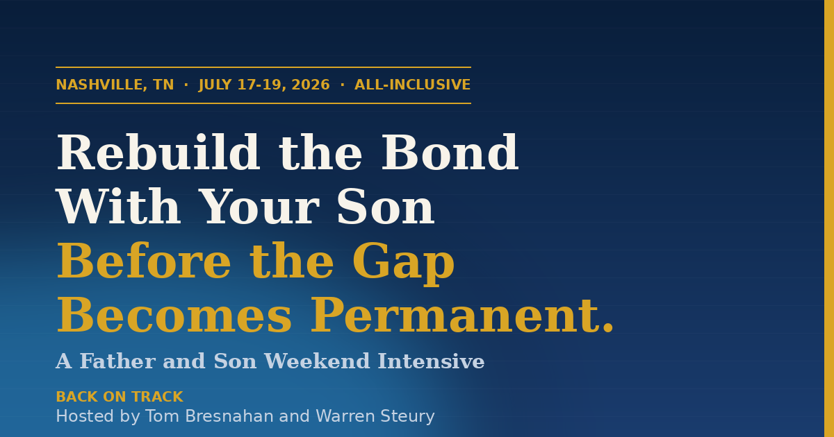 A private, all-inclusive weekend intensive in Nashville, TN for fathers and their teen-20s sons who have drifted apart, stopped talking, or stopped trying. Two days to break down the walls and rekindle the relationship that matters most.